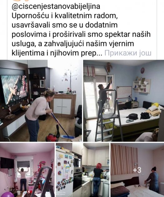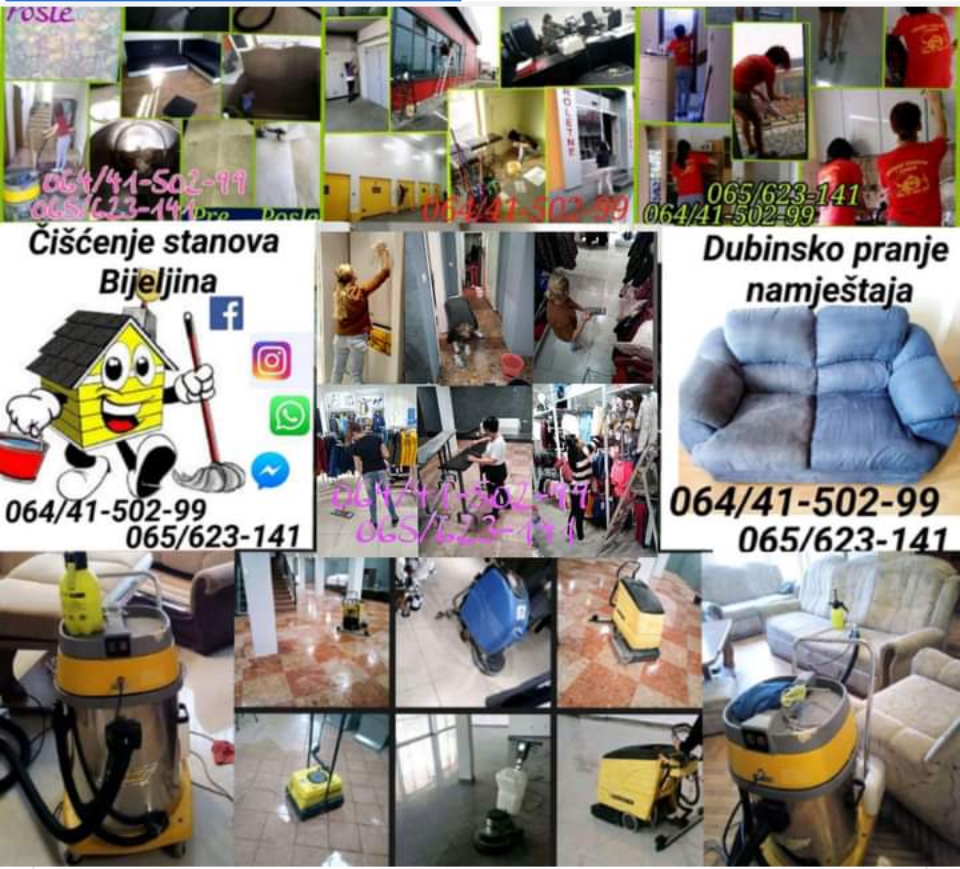 Naš tim čine provjereni iskusni radnici sa dugogodišnjim iskustvom u pružanju usluga čišćenja, bilo da se radi o stambenim ili poslovnim prostorima. Prateći savremene trendove i tehnologije, nastojimo da se kontiniuirano usavršavamo u pružanju visoko kvalitetnih usluga higijenskog održavanja poslovnih i stambenih prostora. Naš cilj je stvaranje i održavanje čistog i zdravog životnog/radnog okruženja za naše klijente. Cijenu naših usluga smo prilagodili standardima na ovim prostorima, kako bi bili dostupni svim korisnicima ove usluge! Pouzdanost, iskustvo, rezultat i kvalitet naših usluga su nam obezbjedili dugogodišnju saradnju sa mnogobrojnim zadovoljnim klijentima. Ukažite nam Vaše povjerenje, pozovite 064/41-502-99(viber, WhatsApp, messenger) ili poziv na br 065/623-141 Posjetite nas i na fb https://www.facebook.com/profile.php?id=100014357619050 https://www.facebook.com/ciscenjestanovabijeljina/