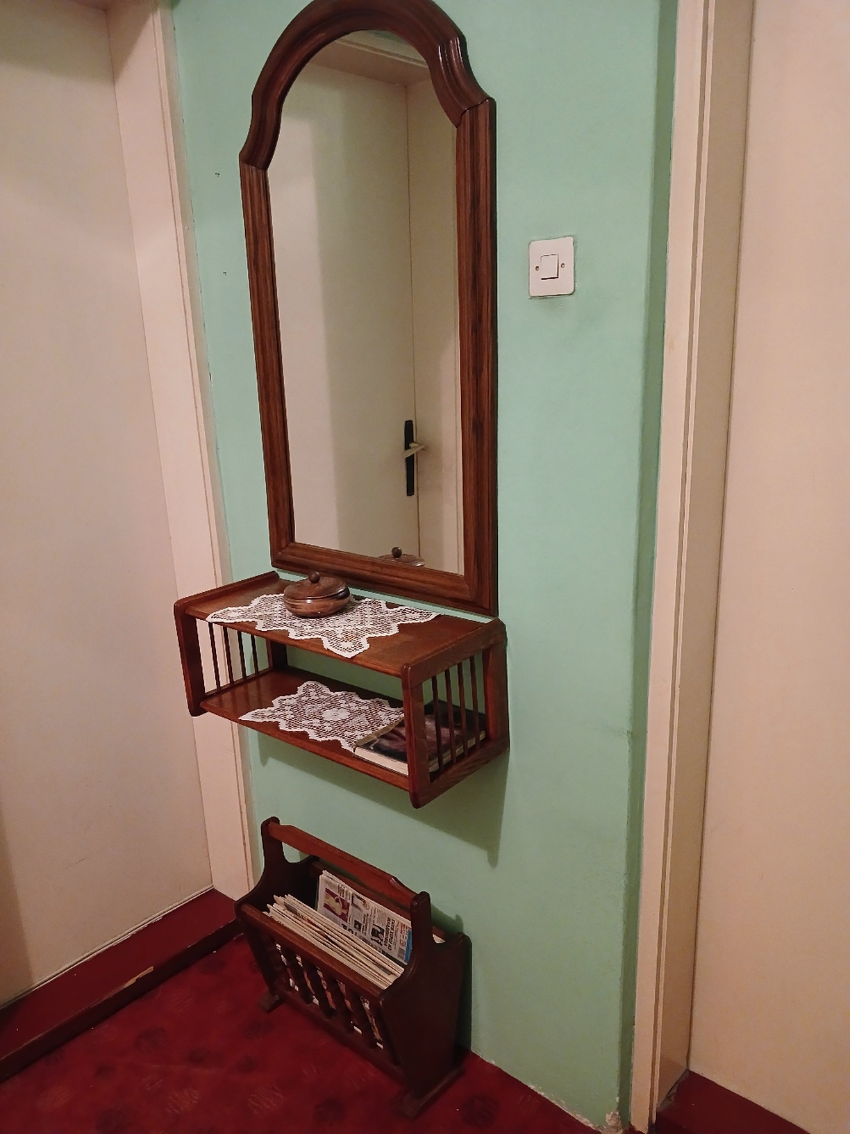 Na prodaju trodijelni set koji ima ogledalo,policu i korpu za novine.
