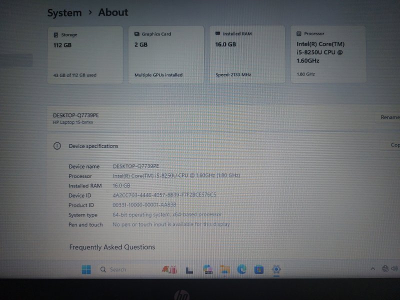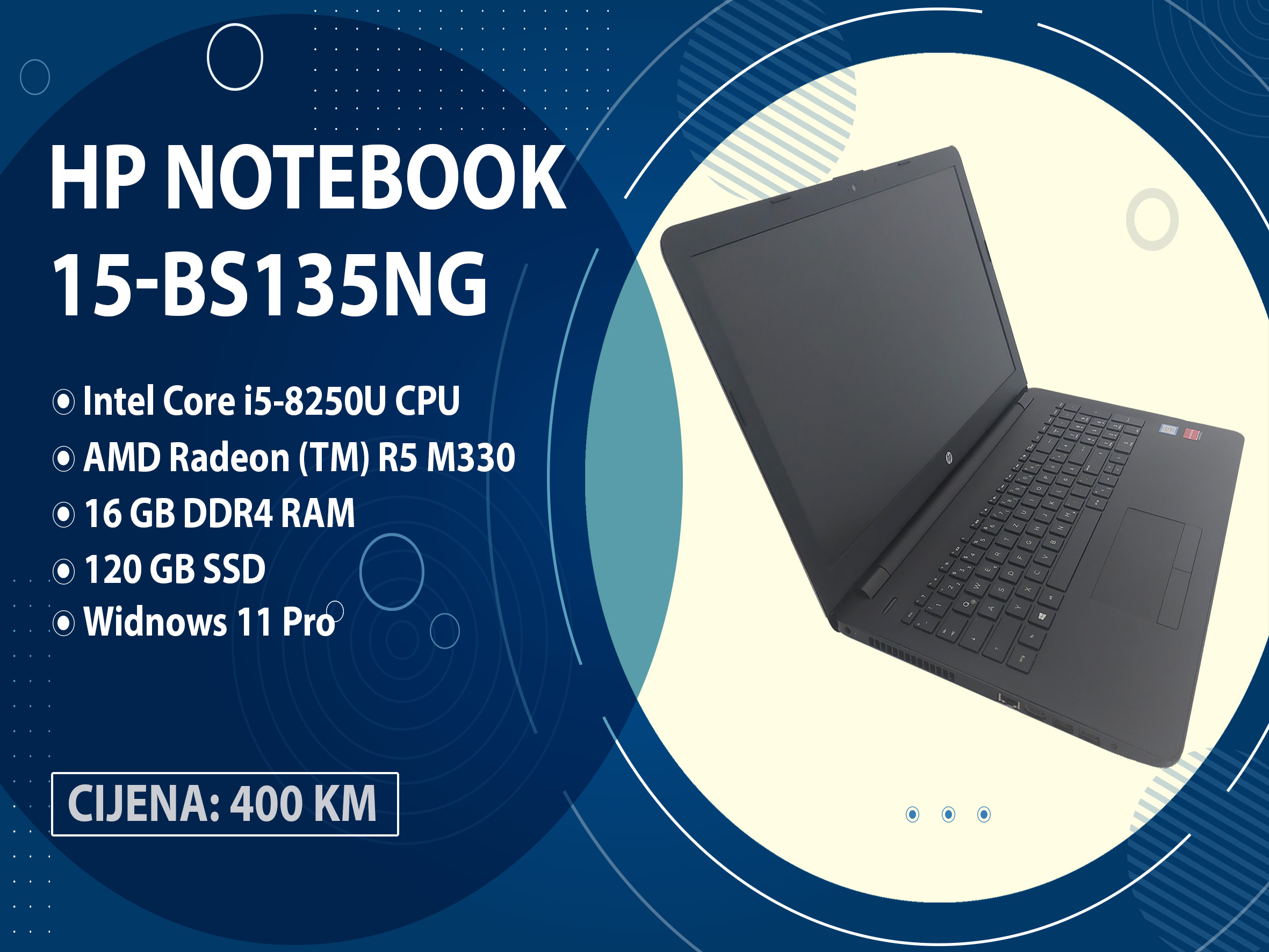 Na prodaju odlično očuvan laptop HP Notebook 15-bs135ng. Na laptopu je sve ispravno i instaliran je sistem Windows 11 Pro, očišćen je od prašine i zamijenjena je termalna pasta. Uz njega dolazi originalni HP adapter. Baterija odlično drži sa 90,5% originalnog kapaciteta, što je prikazano na posljednjoj fotografiji.