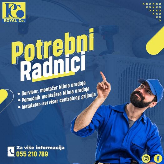 Firma "Royal Company" d.o.o Bijeljina, ovlašteni distributer i uvoznik Hisense i LG klima uređaja, renomirana kompanija u oblasti klimatizacije i ventilacije, poziva kvalifikovane i predane pojedince da se pridruže našem timu na pozicijiama: serviser klima uređaja, montažer klima uređaja, serviseri centralnog grijanja, pomoćnik montažera klima uređaja.