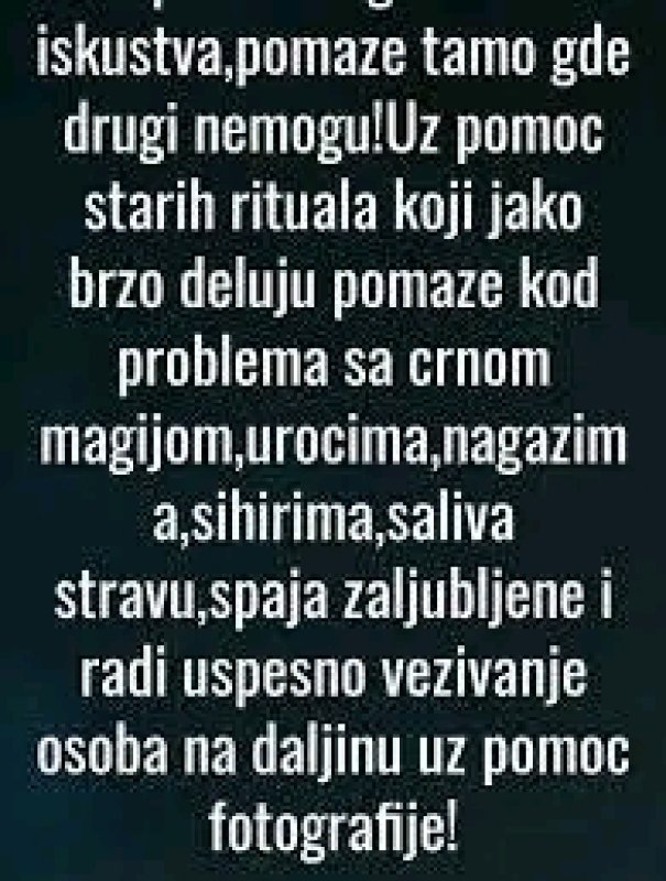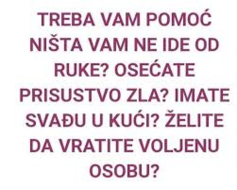 životu,imate ljubavne novčane i porodične probleme.Pozovite i zakažite već danas razgovor da vidimo gde je problem.Vrhunska vidovitost,astrologija,astronumerologija,geneski kod emotivni obrazac misaone slike podsvesti,karmički dug,prepoznavanje crne magije. Skidanje crne magije i uroka,porodicnog proklestva,vracanje voljene osobe i postanite savrsen par,otklanjanje negativne energije