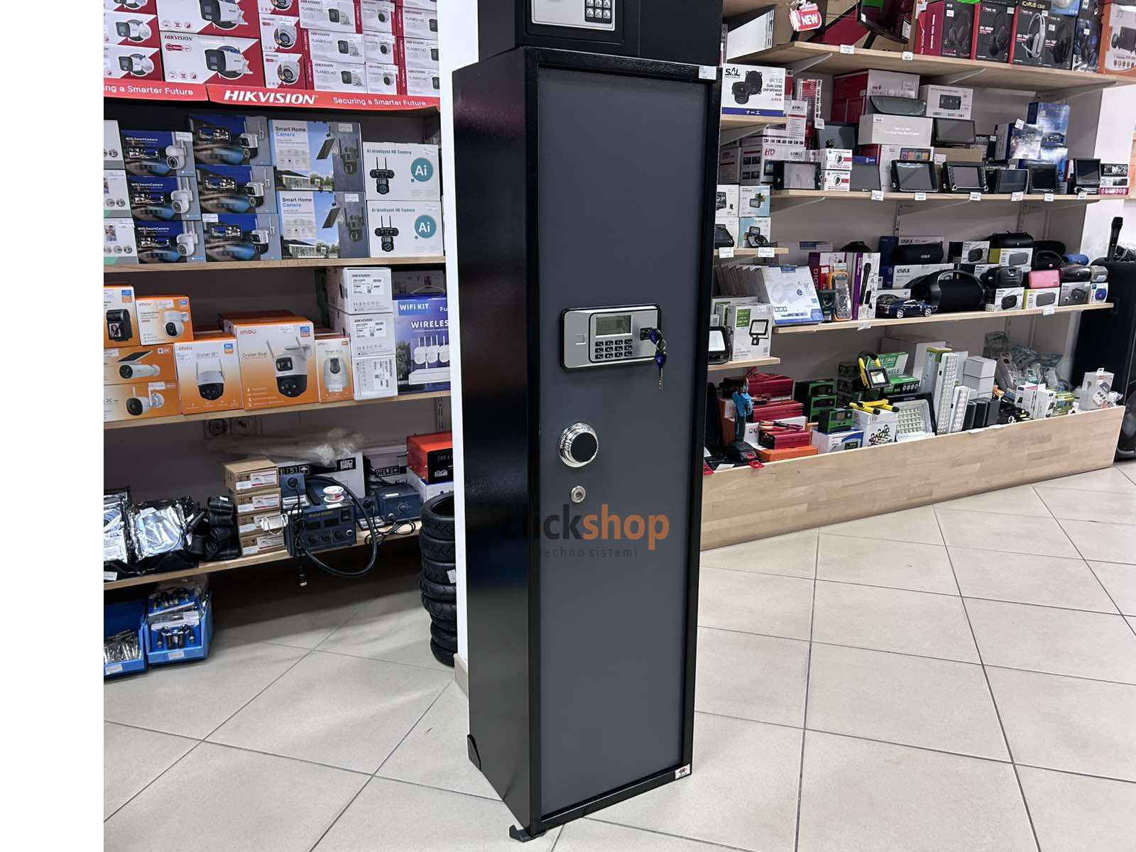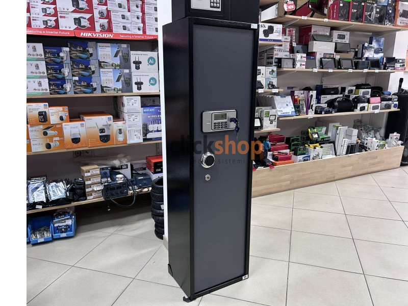 Visoki metalni sef sa digitalnom bravom, idealan za sigurno odlaganje oružja, dokumenata i vrijednosti u domu, kancelariji ili poslovnom prostoru. Robusna konstrukcija i praktične dimenzije 145 × 40 × 30 cm omogućavaju organizovano i zaštićeno čuvanje predmeta uz dodatnu mogućnost zaključavanja ključem.