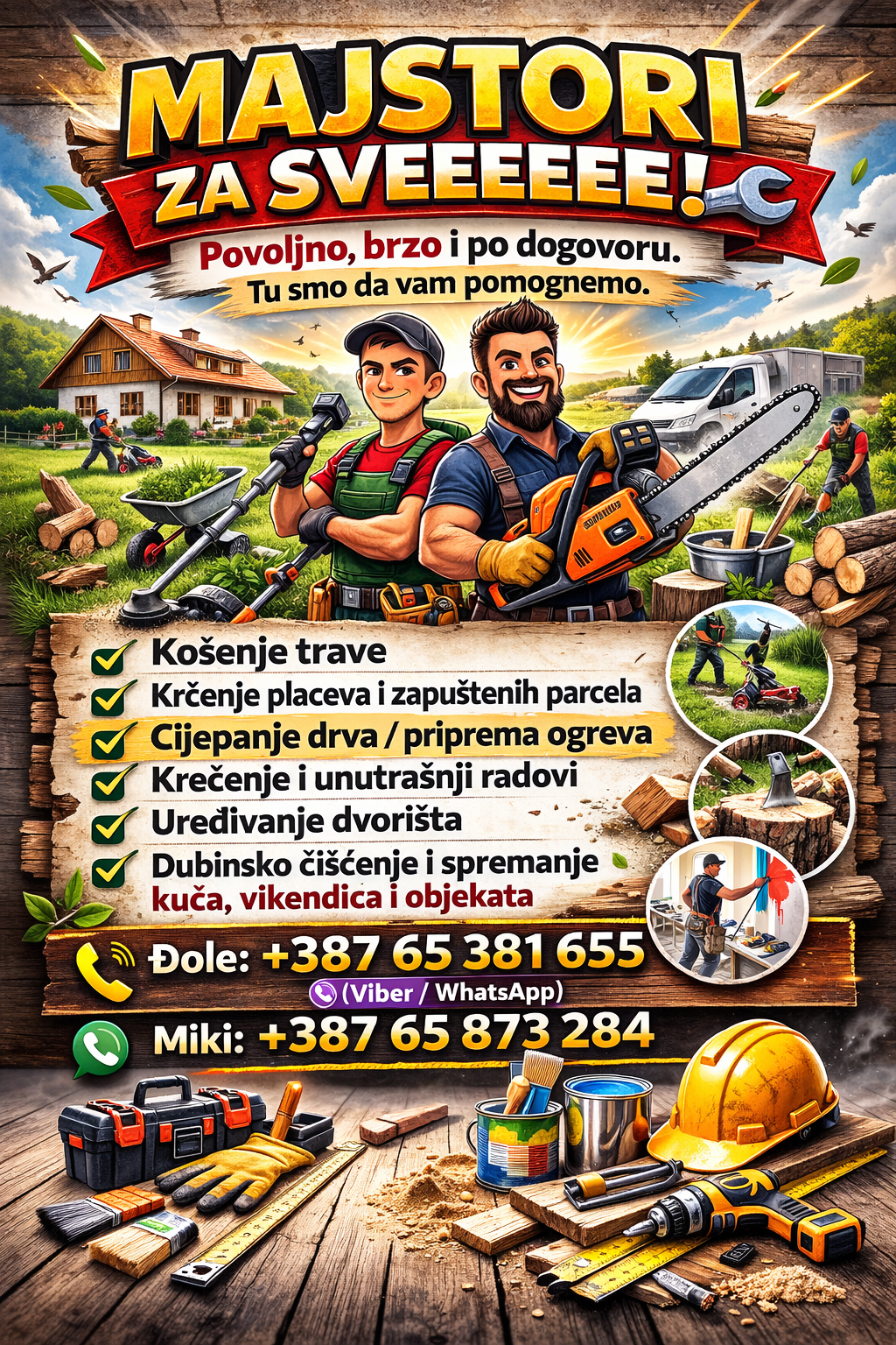 Ako vam treba pomoć u održavanju doma ili dvorišta, na pravom ste mestu! Nudimo profesionalne usluge dubinskog čišćenja nameštaja, automobila i tepiha. Pored toga, bavimo se i košenjem trave, krčenjem i održavanjem dvorišta, kao i krečenjem. Sve na jednom mestu!