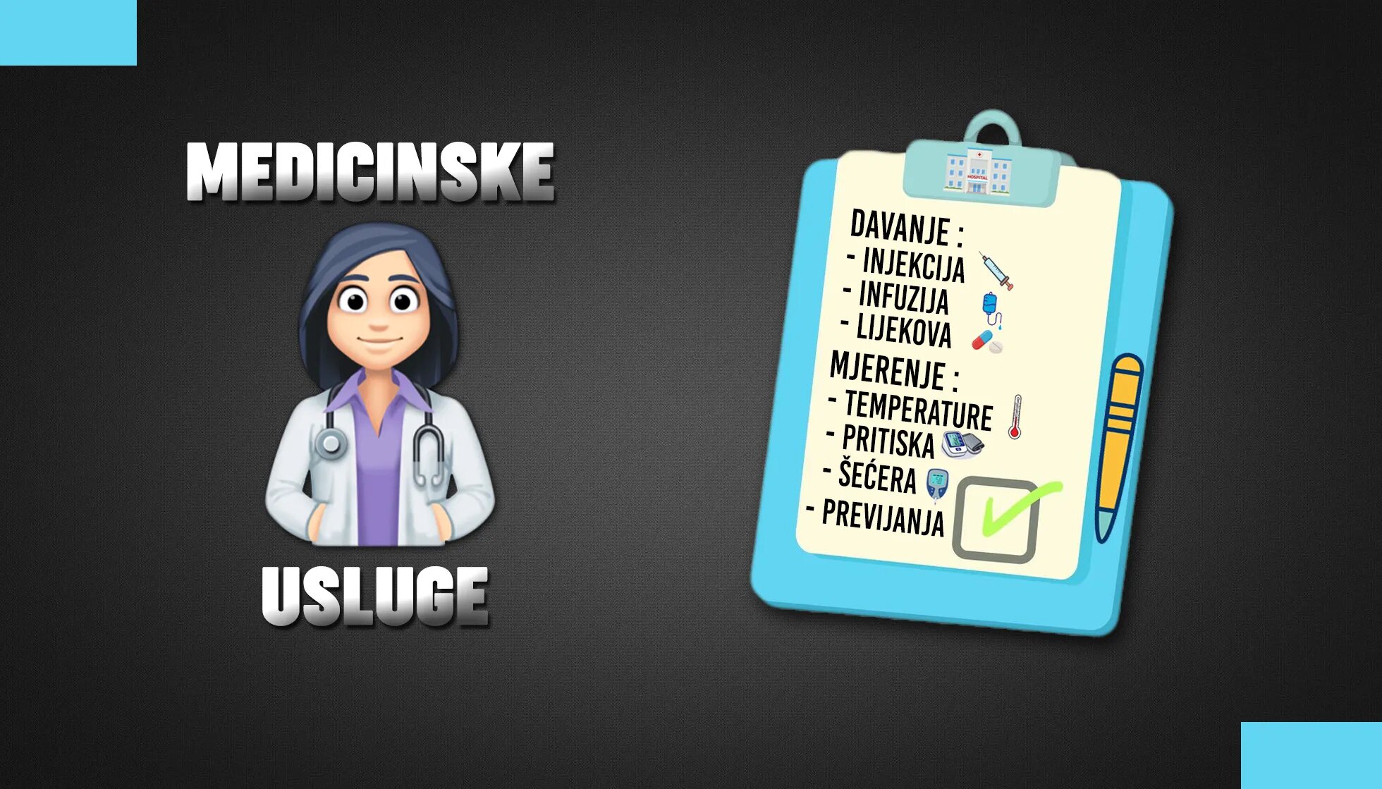 Aplikacija terapije(I.m./i.v./s.c./s.l.),mjerenje parametara(pritisak,secer,temper.)i previjanja