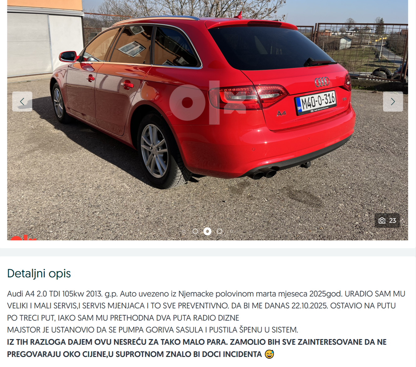 "Majstor je ustanovio da se pumpa goriva "sasula i pustila špenu u sistem", te iz tih razloga dajem ovu nesreću za tako malo para. Zamolio bih sve zainteresovane da ne pregovaraju oko cijene,u suprotnom znalo bi doći do incidenta", naveo je korisnik na sajtu za oglašavanje "olx.ba". TEKST SE NASTAVLJA NAKON VIDEO OGLASA