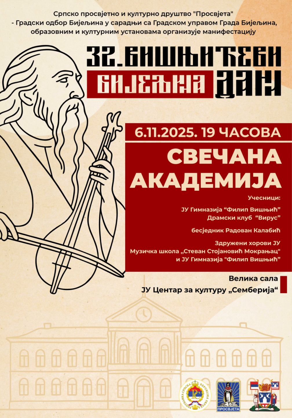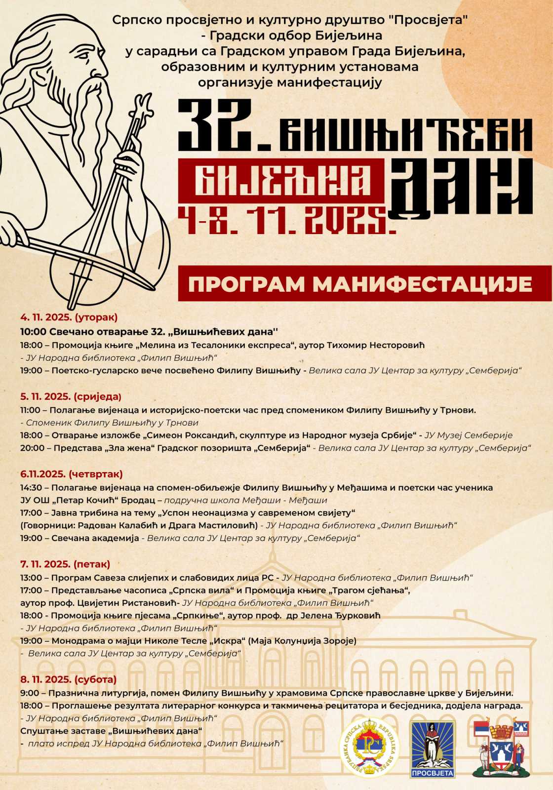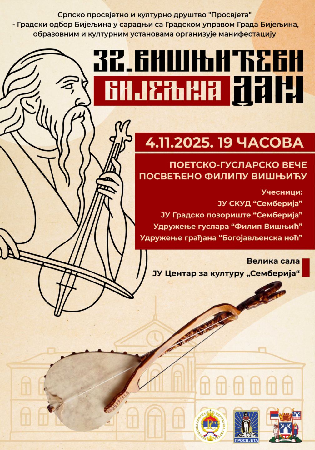 U znak sjećanja na lik i djelo velikog srpskog pisca i guslara Filipa Višnjića, manifestaciju organizuje Srpsko prosvjetno i kulturno društvo „Prosvjeta“ – Gradski odbor Bijeljina, u saradnji sa Gradskom upravom Grada Bijeljina i kulturnim ustanovama. TEKST SE NASTAVLJA NAKON VIDEO OGLASA