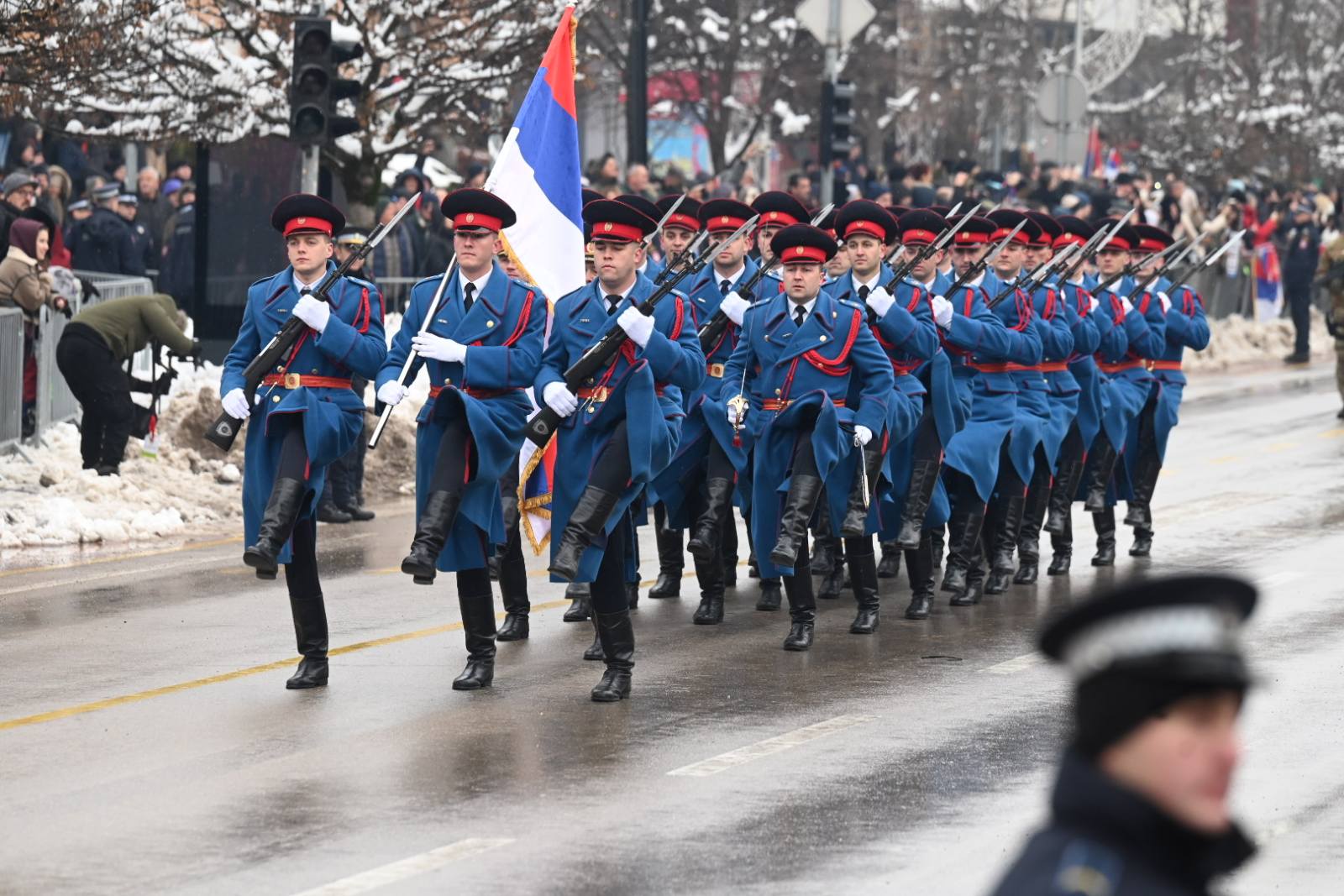 Na čelu ešalona jedinica i motorizovanih ešalona Ministarstva unutrašnjih poslova Republike Srpske kreće se rukovodilac Svečanog defilea Igor Kušić. Iza rukovodioca Svečanog defilea nailazi Zastavni vod.