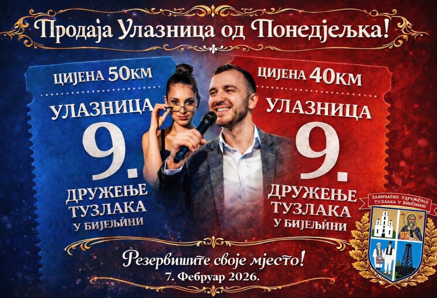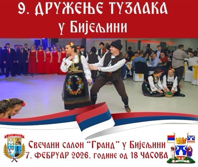 Zavičajno udruženje Tuzlaka u Bijeljini, pod pokroviteljstvom Grada Bijeljina, 9. put organizuje već tradicionalo veliko druženje Tuzlaka koje će se održati u subotu, 7. februara 2026. godine u Svečanom salonu "Grand" u Bijeljini od 18.00 časova. Ulaznice u prodaji od 12. januara, u kancelariji Svečanog salona “Grand” u Bijeljini. TEKST SE NASTAVLJA NAKON VIDEO OGLASA