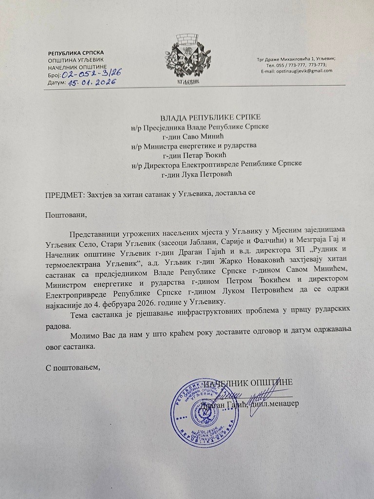 Kako je navedeno u zahtjevu, sastanak bi trebalo da se održi najkasnije do 4. februara 2026. godine u Ugljeviku, a tema razgovora bilo bi rješavanje infrastrukturnih problema nastalih usljed širenja površinskog kopa Rudnika Ugljevik. TEKST SE NASTAVLJA NAKON VIDEO OGLASA