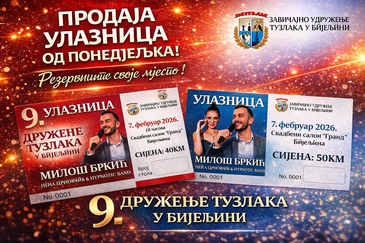 Ulaznice su u prodaji po cijeni od 40 i 50 KM, u kancelariji Svečanog salona “Grand“, a dodatne informacije na +387 65 941 079 (Dragica Tomić) i +387 65 651 695 (Mijo Vujanović)