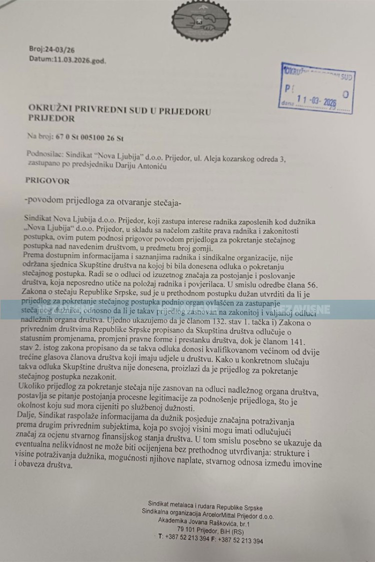 "Sud je dužan utvrditi da li je prijedlog za pokretanje stečaja podnio organ koji je za to ovlašćen i da li je takav prijedlog zasnovan na zakonitoj odluci nadležnih organa društva", navodi se u prigovoru Sindikata.