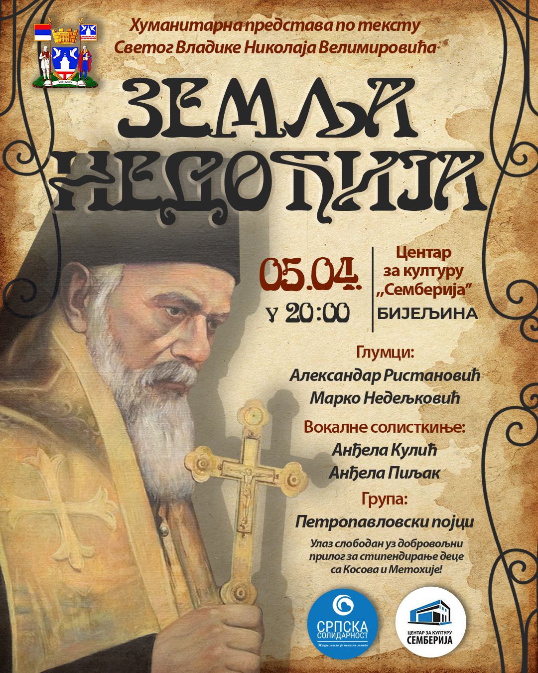 Publika će imati priliku da uživa u snažnoj i duhovno nadahnutoj scenskoj interpretaciji, u izvođenju glumaca Aleksandara Ristanovića i Mirka Nedeljkovića. Muzički dio programa upotpuniće vokalne solistkinje Anđela Kulić i Anđela Piljak, dok će poseban doprinos atmosferi dati gosti – Petropavlovski pojci.