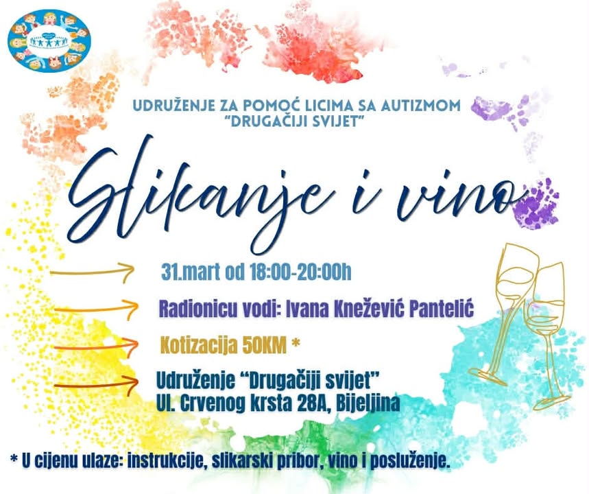 Radionica će biti upriličena 31. marta u prostorijama Udruženja, u terminu od 18:00 do 20:00 časova, a vodiće je Ivana Pantelić Knežević, grafička dizajnerka. Ovaj događaj zamišljen je kao opušteno i inspirativno druženje, gdje će učesnici imati priliku da slikaju, upoznaju nove ljude i uživaju u čaši vina – bez obzira na prethodno iskustvo u slikanju.