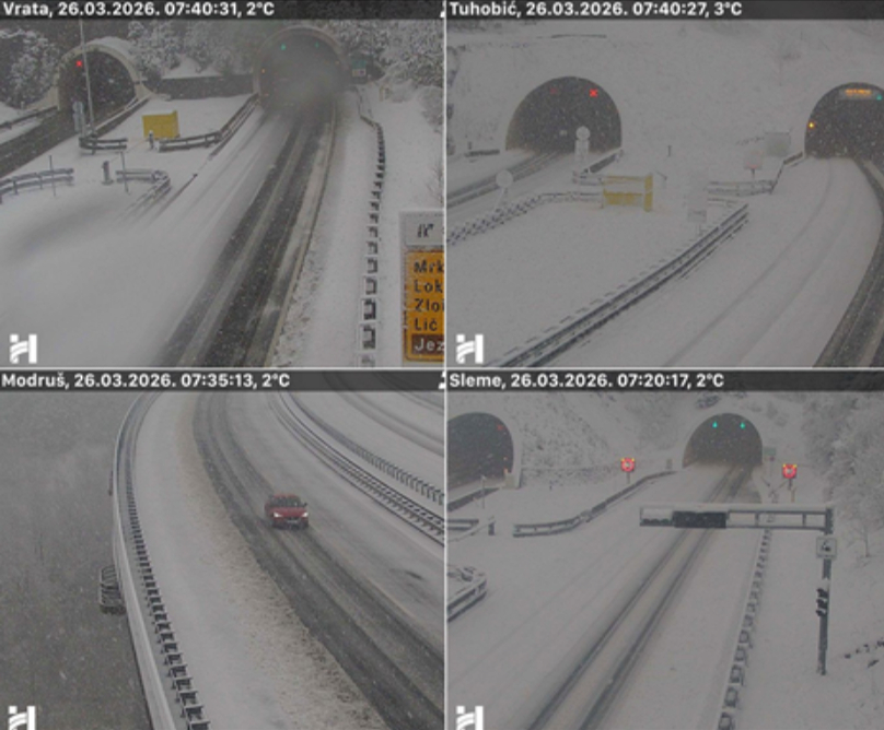 Zimski uslovi vladaju na pojedinim putevima u Gorskom kotaru i Lici. U priobalju duva jak vjetar, zbog čega su na snazi zabrane za pojedine kategorije vozila. Obustavljen je potpuno saobraćaj za kamione s prikolicama i šlepere.