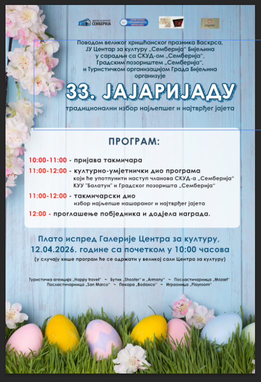 Takmičarski dio predviđen je od 11.00 do 12.00 časova, kada će se birati najljepše našarano i najtvrđe jaje, dok je proglašenje pobjednika i dodjela nagrada planirana u 12.00 časova.